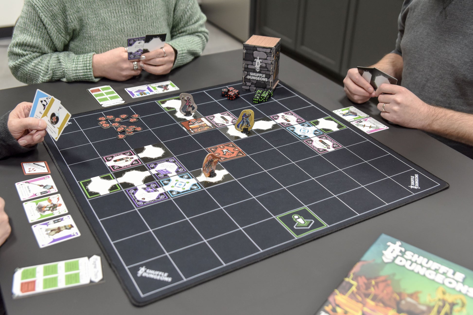 Shuffle Dungeons is a co-operative dungeon crawling board game for 1-4 players. Players build the dungeon as they explore, and you never know what might be waiting around the corner. Monsters, traps, and loot are waiting for a hero brave enough to face the unknown.
